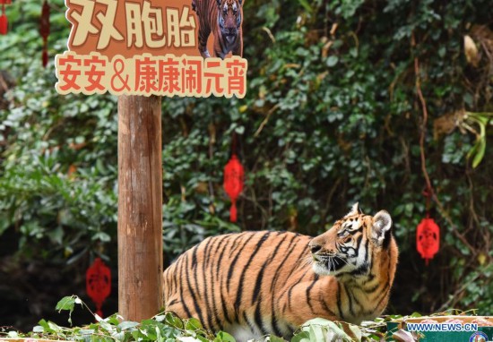 A twin brother of the South China tiger is seen at the Chimelong Safari Park in Guangzhou, south China's Guangdong Province, Feb. 25, 2021. An'an and Kangkang (respectively meaning safe and healthy in Chinese) are twin brothers of the South China tiger born in June 2020. They celebrated the Lantern Festival on Thursday by eating meat balls instead of glutinous rice flour balls typically consumed by people for this festival, which marks the end of the Lunar New Year holiday. (Xinhua/Liu Dawei)