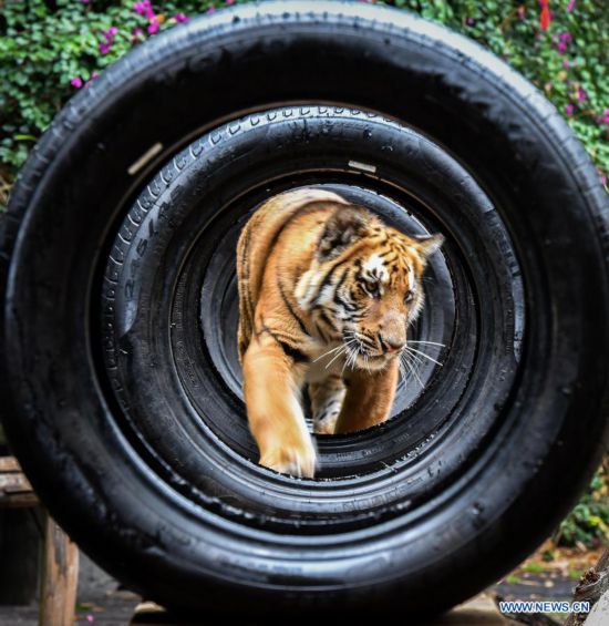 A twin brother of the South China tiger is seen at the Chimelong Safari Park in Guangzhou, south China's Guangdong Province, Feb. 25, 2021. An'an and Kangkang (respectively meaning safe and healthy in Chinese) are twin brothers of the South China tiger born in June 2020. They celebrated the Lantern Festival on Thursday by eating meat balls instead of glutinous rice flour balls typically consumed by people for this festival, which marks the end of the Lunar New Year holiday. (Xinhua/Liu Dawei)