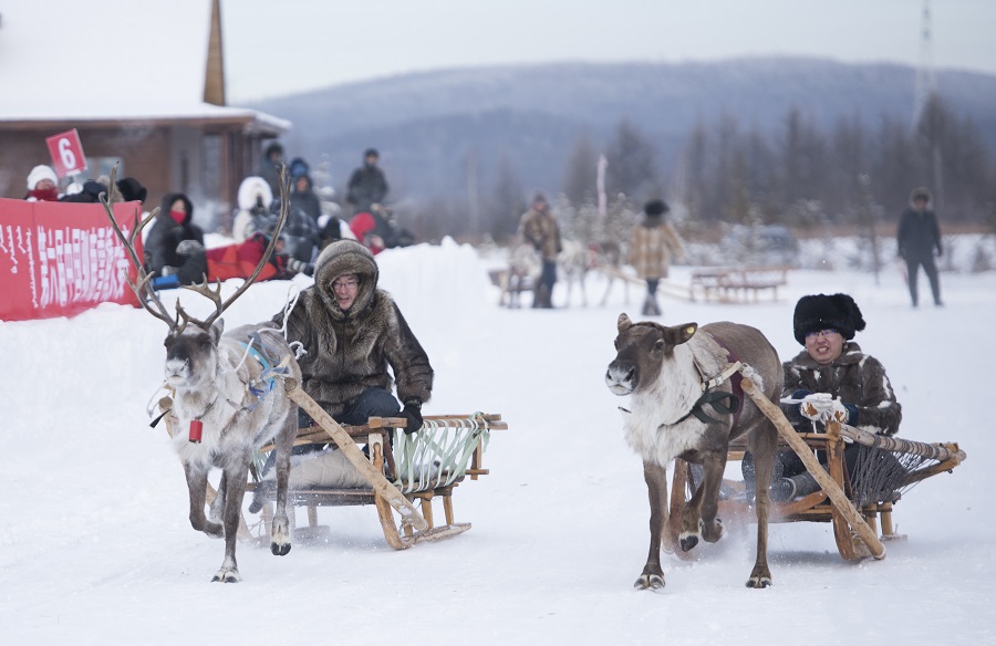 People participate in a reindeer-pulled sled race in Aoluguya Ewenki autonomous township in Hulunbuir, North China's Inner Mongolia autonomous region, Dec 25, 2019. (chinadaily.com.cn/Wang Zheng)