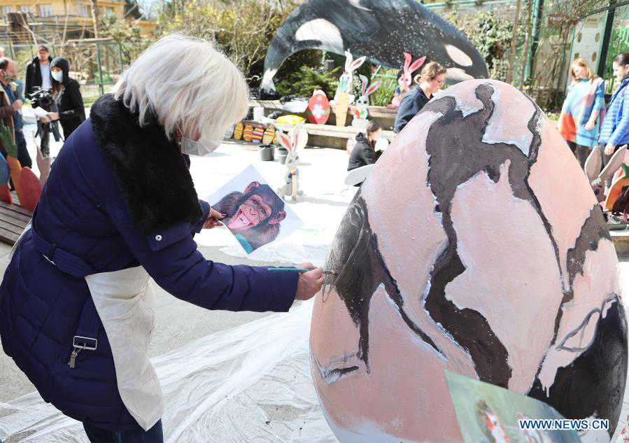 People paint huge Easter eggs at the Zagreb Zoo in Zagreb, Croatia, on March 16, 2021. (Marko Prpic/Pixsell via Xinhua)