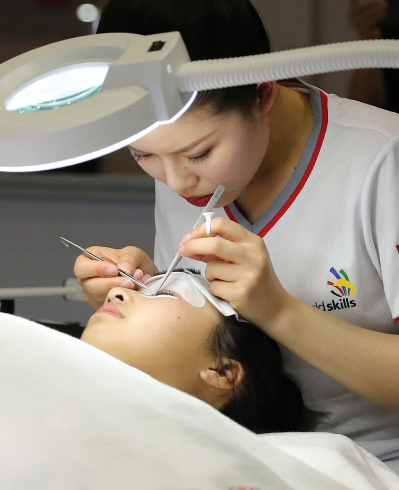 A participant performs an eyelash extension procedure during an international skill competition, held in Shanghai on June 3, 2018 (Photo/Xinhua)