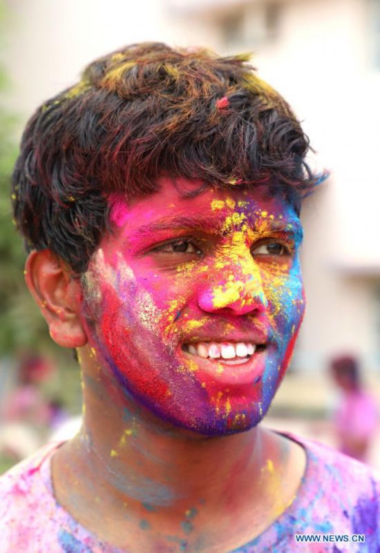 A man is smeared with colored powder as people celebrate Holi Festival, the festival of colors, in Bangalore, India, March 28, 2021. (Str/Xinhua)
