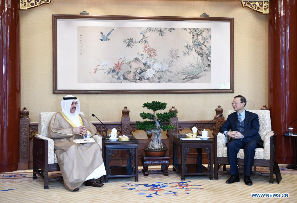 Yang Jiechi, a member of the Political Bureau of the Communist Party of China (CPC) Central Committee and director of the Office of the Foreign Affairs Commission of the CPC Central Committee, meets with Kuwaiti ambassador to China Sameeh Essa Johar Hayat in Beijing, capital of China, March 31, 2021. (Xinhua/Shen Hong)