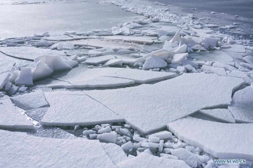 Aerial photo taken on March 30, 2021 shows a view of Qinghai Lake in northwest China's Qinghai Province. The frozen lake has started to thaw as the temperature rises in spring. (Xinhua/Wu Gang)