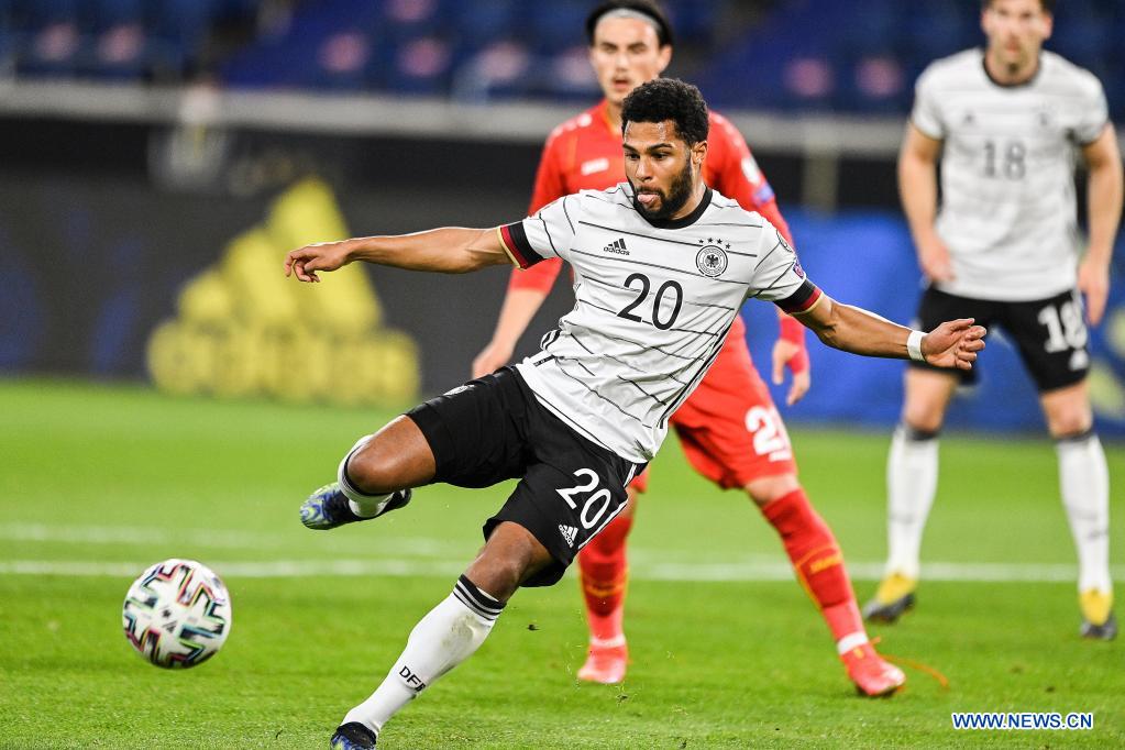 Serge Gnabry (top) of Germany breaks through the defense from Arijan Ademi of North Macedonia during a FIFA World Cup 2022 qualifier Group J match between Germany and North Macedonia in Duisburg, Germany, March 31, 2021. (Photo by Ulrich Hufnagel/Xinhua)