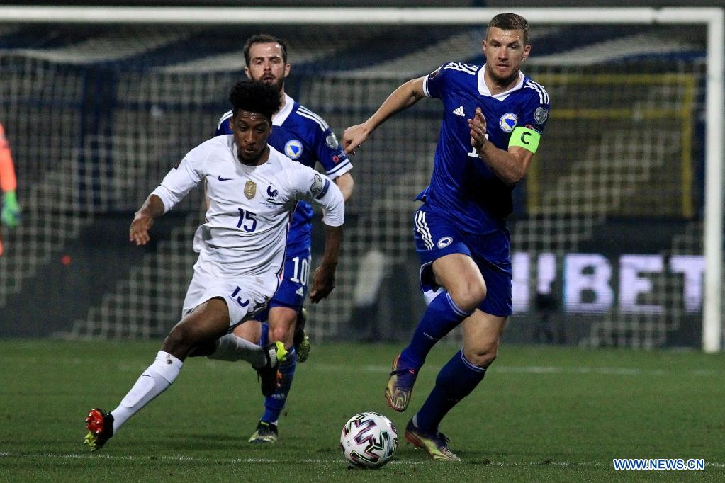 Edin Dzeko (R) of Bosnia and Herzegovina competes with Kingsley Coman (L) of France during the FIFA World Cup Group D qualifying round match Between Bosnia and Herzegovina (BiH) and France in Sarajevo, BiH, on March 31, 2021. (Photo by Nedim Grabovica/Xinhua)