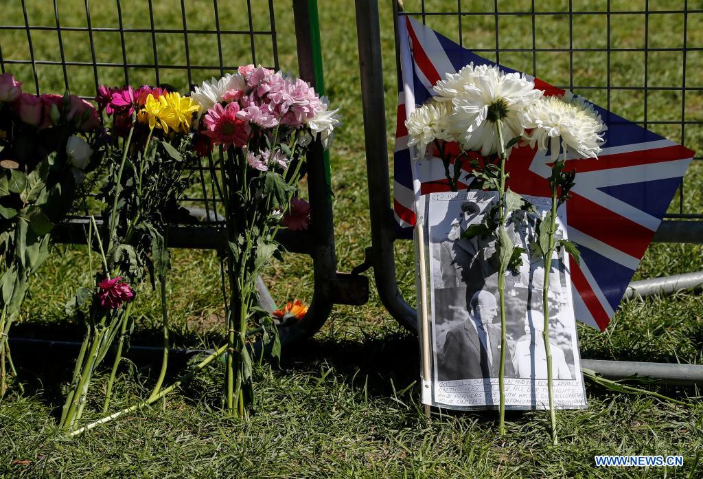 Photo taken on April 17, 2021 shows floral tributes placed on the Long Walk outside Windsor Castle ahead of the funeral of Britain's Prince Philip, the Duke of Edinburgh, in Windsor, Britain. The funeral of the Duke of Edinburgh was held Saturday in Windsor in line of the British government's coronavirus restrictions. Britain fell silent for a minute of reflection ahead of Prince Philip's funeral which began at 15:00 BST (1400 GMT) at St. George's Chapel, in the grounds of Windsor Castle, which is about 35 kilometers away from central London. (Xinhua/Han Yan)
