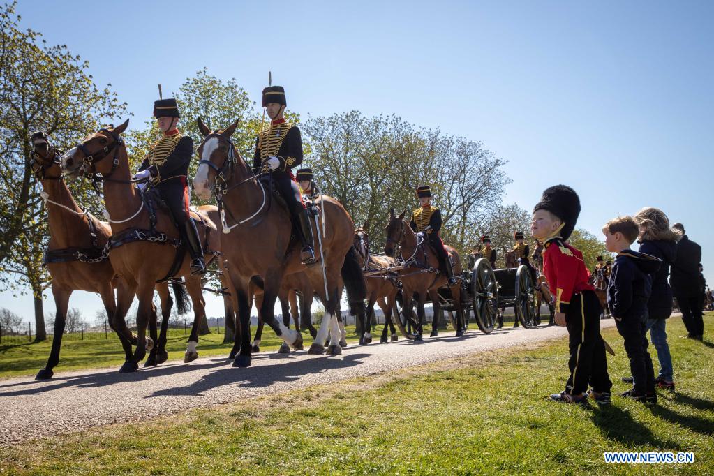 Mounted soldiers parade along the Long Walk outside Windsor Castle ahead of the funeral of Britain's Prince Philip, the Duke of Edinburgh, in Windsor, Britain, on April 17, 2021. The funeral of the Duke of Edinburgh was held Saturday in Windsor in line of the British government's coronavirus restrictions. Britain fell silent for a minute of reflection ahead of Prince Philip's funeral which began at 15:00 BST (1400 GMT) at St. George's Chapel, in the grounds of Windsor Castle, which is about 35 kilometers away from central London. (Photo by Tim Ireland/Xinhua)