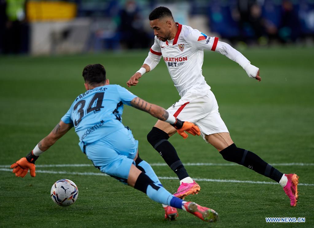 Levante's goalkeeper Dani Cardenas (L) defends Youssef En-Nesyri of Sevilla during a Spanish League football match between Levante UD and Sevilla CF in Valencia, Spain, on April 21, 2021. (Photo by Pablo Morano/Xinhua)
