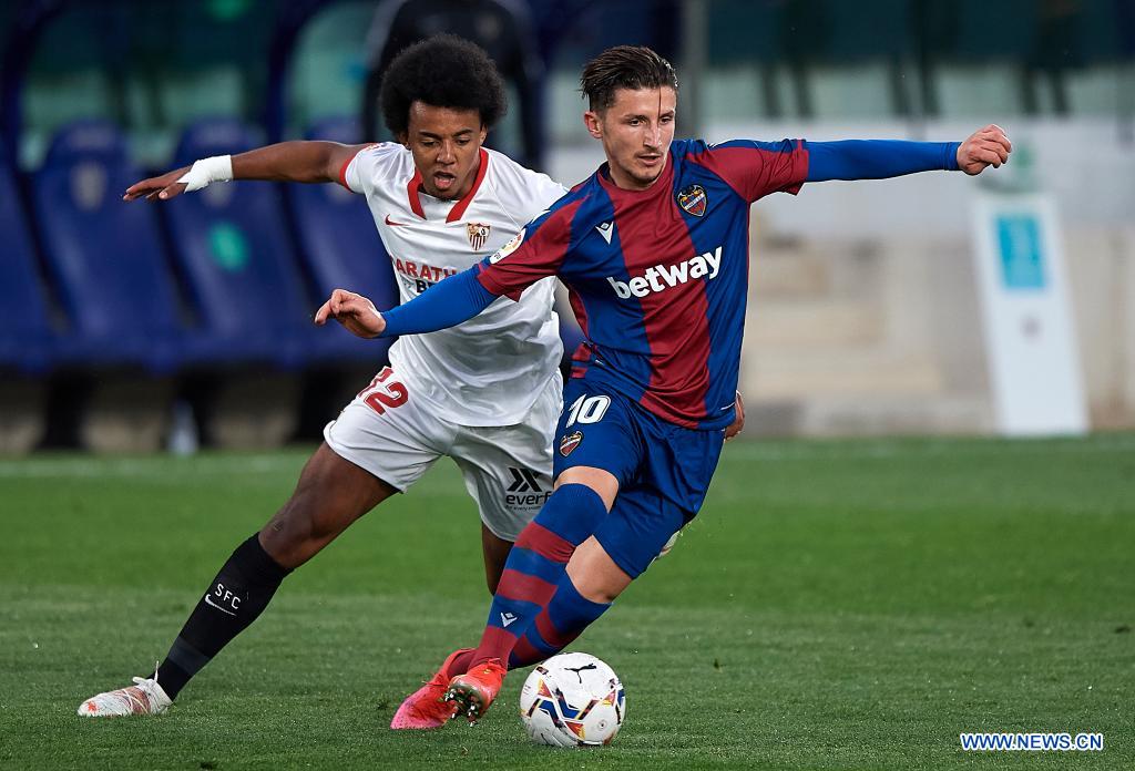 Enis Bardhi (R) of Levante vies with Jules Kounde of Sevilla during a Spanish League football match between Levante UD and Sevilla CF in Valencia, Spain, on April 21, 2021. (Photo by Pablo Morano/Xinhua)