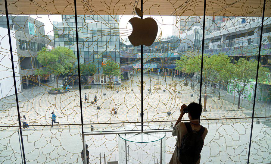 A journalist takes photos during a preview activity at the new Apple retail store in Sanlitun of Beijing, capital of China, July 16, 2020. (Xinhua/Cai Yang)