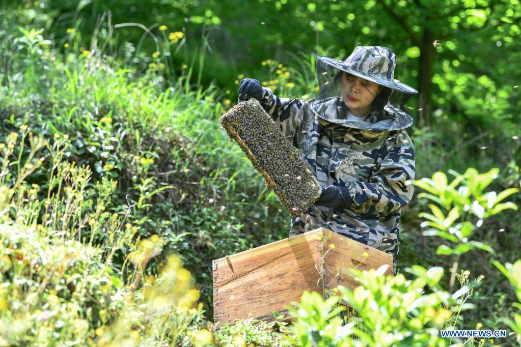 Yuan Xiaomei works at her bee breeding base in Nayong County, southwest China's Guizhou Province, April 29, 2021. When Yuan Xiaomei was a child, honey was a luxury for local people. So she always has a dream that her fellow villagers could afford the organic honey. In 2019, Yuan Xiaomei gave up her career in Fujian Province and came back to her hometown and opened a bee breeding base in the mountainous Nayong County and shared her beekeeping skills with the villagers free of charge. During the process of learning beekeeping technologies, Yuan Xiaomei encountered numerous difficulties and was stung by bees many times. However, with her persistence and love for this cause and the help of e-commerce platform, she has successfully explored domestic and foreign markets and helped the surrounding villages develop a bee breeding industry with an annual output value of nearly one million yuan (about 154,537 U.S. dollars). Yuan Xiaomei still has many plans. She wants to provide trainings for more villagers and lead more people into this "sweet cause" to have a better life. "This is also my sweet dream," said Yuan Xiaomei. (Xinhua/Yang Wenbin)