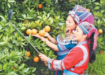 Villagers in Jiangyong county, Yongzhou, central China's Hunan province sell oranges on a livestreaming platform after collecting their harvest, April 29.