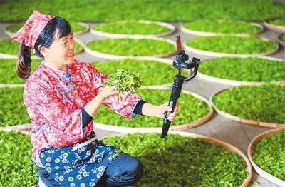 A woman introduces the process for making tea on a livestream platform in Baokang county, Xiangyang, central China's Hubei province, April 15.