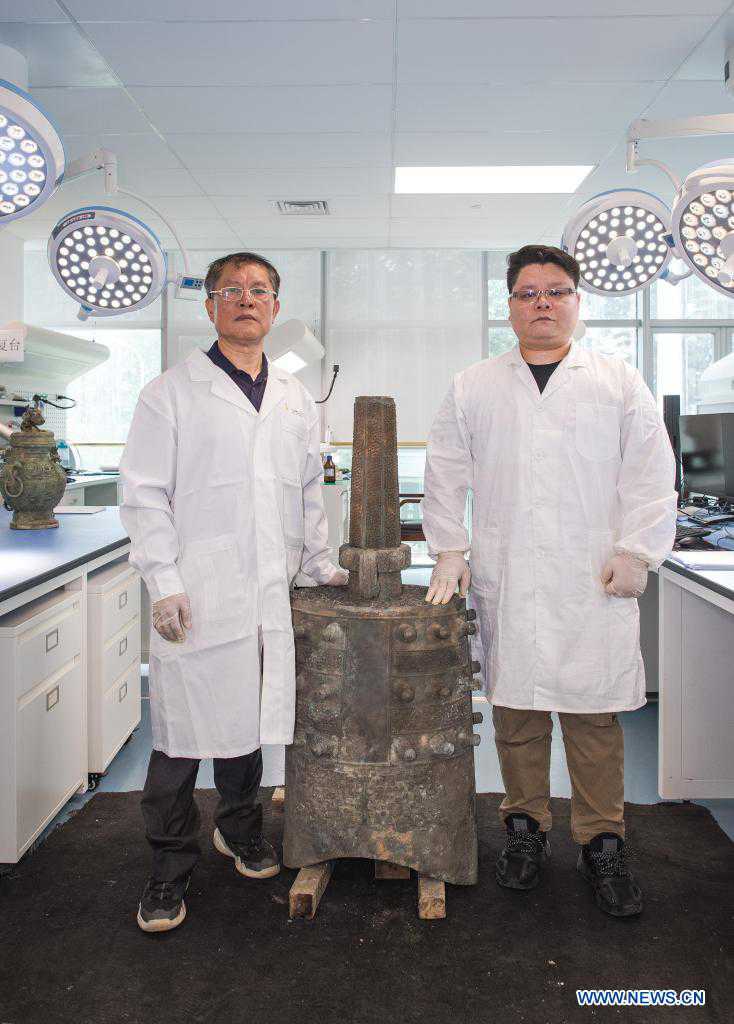 Fang Guorong (L) and his son Fang Chen pose for a photo with an almost restored Zenghouyu bronze chime bell in Hubei Provincial Museum, Wuhan, central China's Hubei Province, May 14, 2021. In the Culture Relics Protection Center of Hubei Provincial Museum, 62-year-old Fang Guorong and his 33-year-old son Fang Chen have been repairing Zenghouyu bronze chime bell for nearly two years. The repair work is about to be completed after a series of complicated processes. Fang Guorong has engaged in bronze ware restoration for more than 40 years since he entered the Hubei Provincial Museum at the age of 18, and now is an expert in this field in Hubei. Since 2009, Fang Chen has begun to learn bronze relic restoration skills from his father and received strict training. After five years of learning and practice, Fang Chen was able to restore bronze wares independently. This time, to restore the Zenghouyu bronze chime bell, Fang Chen applied advanced techniques such as 3D scanning and 3D printing technologies. Now Fang Chen has continued his father's career and devoted himself in the restoration of bronze ware. (Xinhua/Xiao Yijiu)
