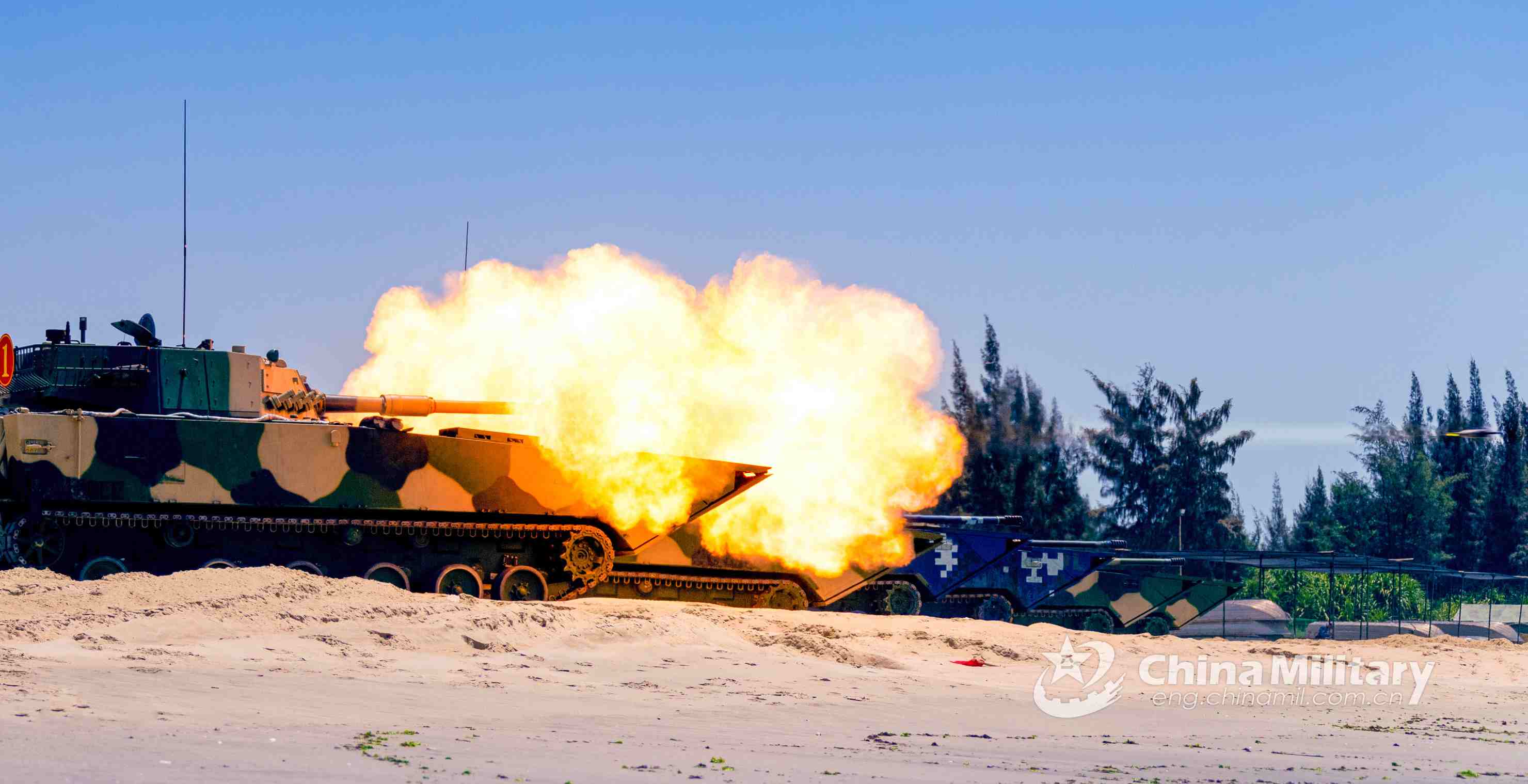 Armored vehicles attached to an armored training group of the PLA Navy’s Marine Corps fire at mock maritime targets with live ammunition during a training exercise on April 23, 2021. (eng.chinamil.com.cn/Photo by Sun Hongtao)