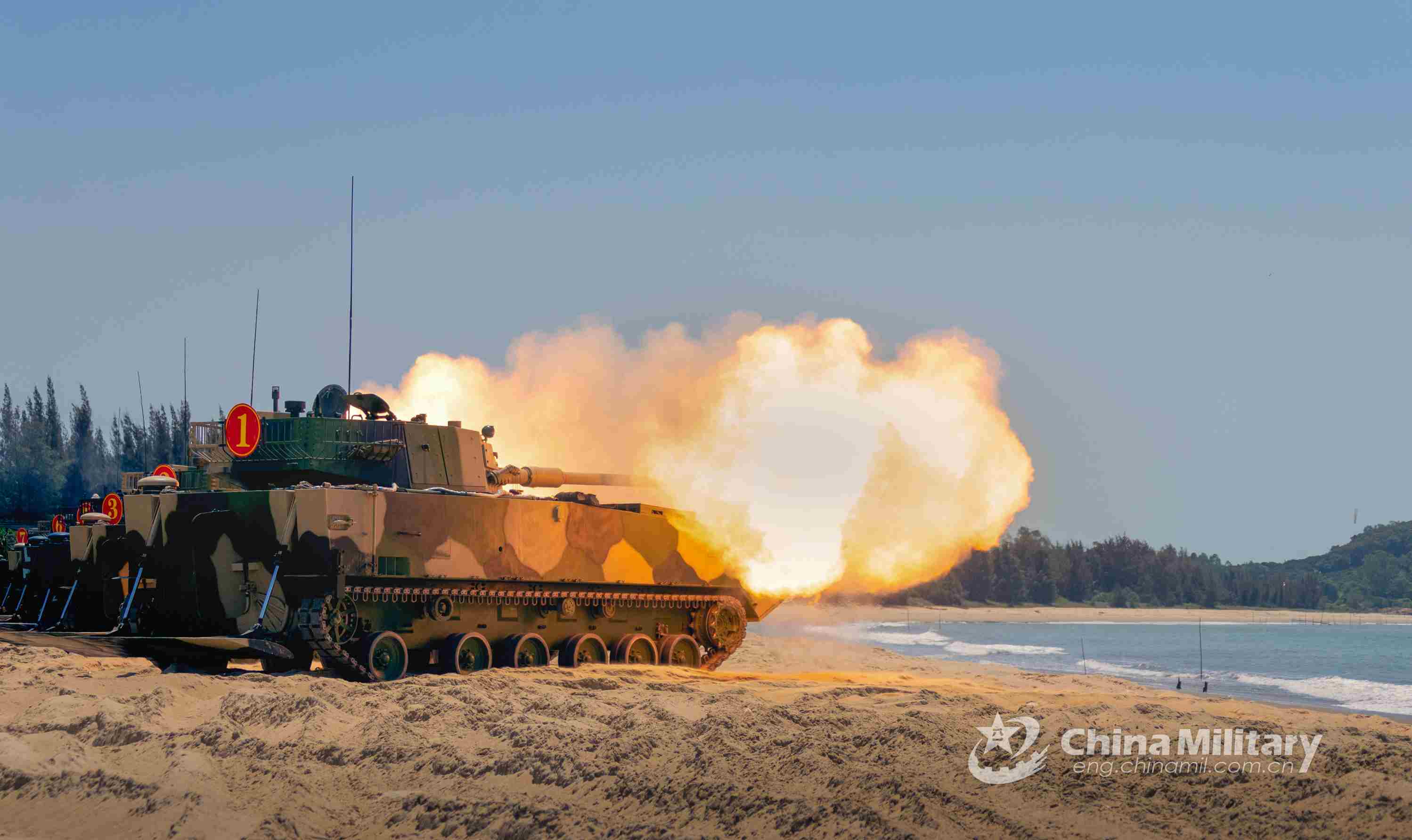 Armored vehicles attached to an armored training group of the PLA Navy’s Marine Corps fire at mock maritime targets with live ammunition during a training exercise on April 23, 2021. (eng.chinamil.com.cn/Photo by Sun Hongtao)