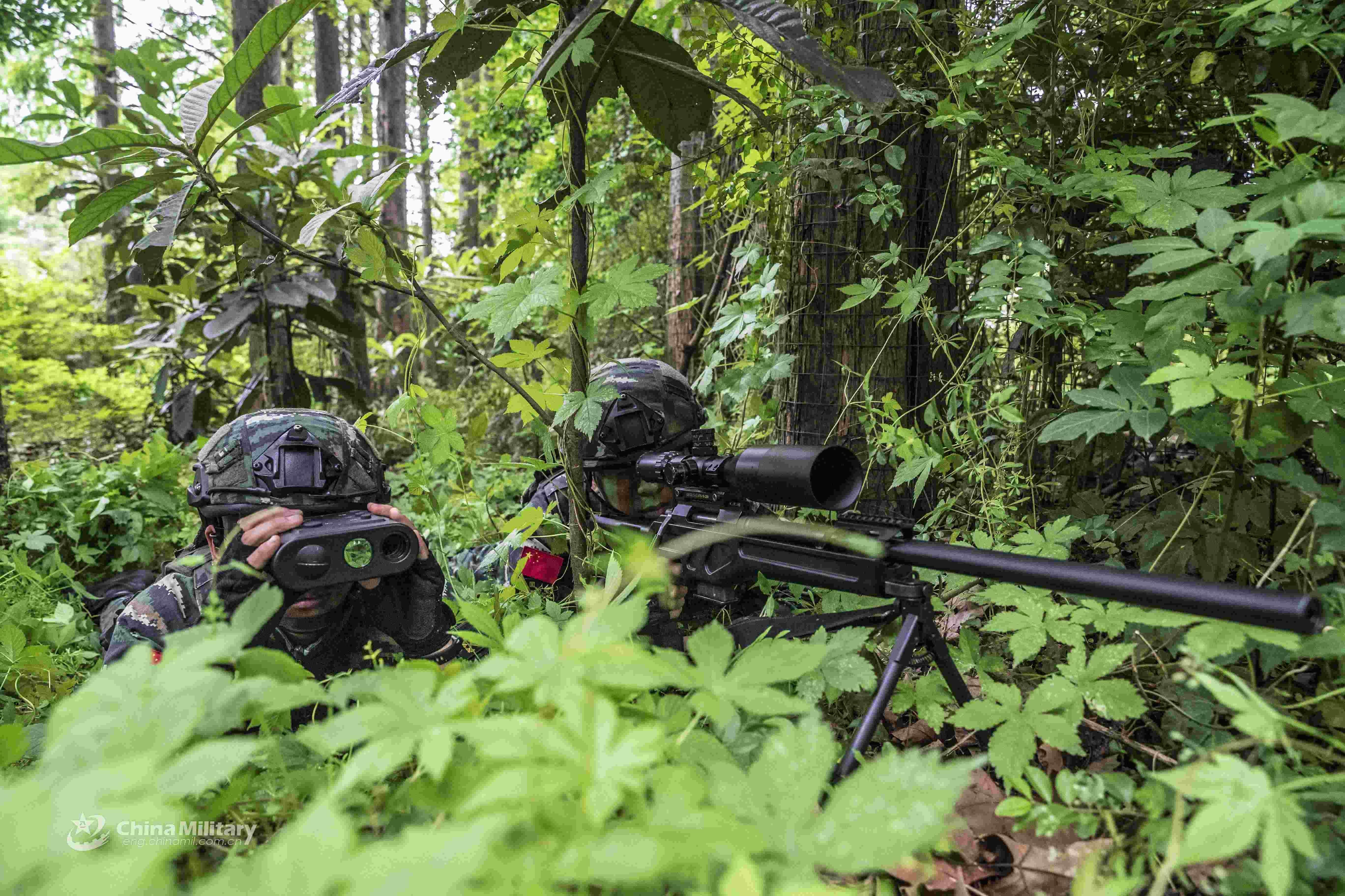 Snipers assigned to a detachment of the 2nd Mobile Corps under the Chinese People's Armed Police (PAP) take up a concealed position and pinpoint the target during an anti-terrorism drill in late April,2021.(eng.chinamil.com.cn/Photo by Yang Xiaochen)