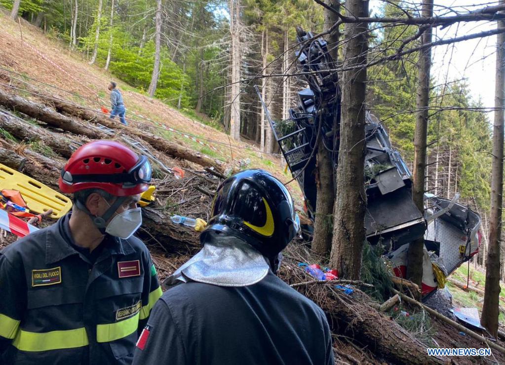 Rescuers work by the wreckage of a cable car after it falls in north Italy's Piedmont region, May 23, 2021. At least 13 people were killed when a cable car fell in north Italy's Piedmont region. (Vigili del Fuoco/Handout via Xinhua)