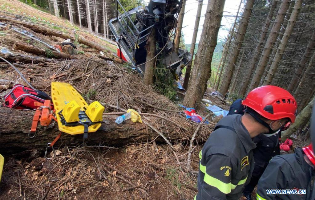 Rescuers work by the wreckage of a cable car after it falls in north Italy's Piedmont region, May 23, 2021. At least 13 people were killed when a cable car fell in north Italy's Piedmont region. (Vigili del Fuoco/Handout via Xinhua)