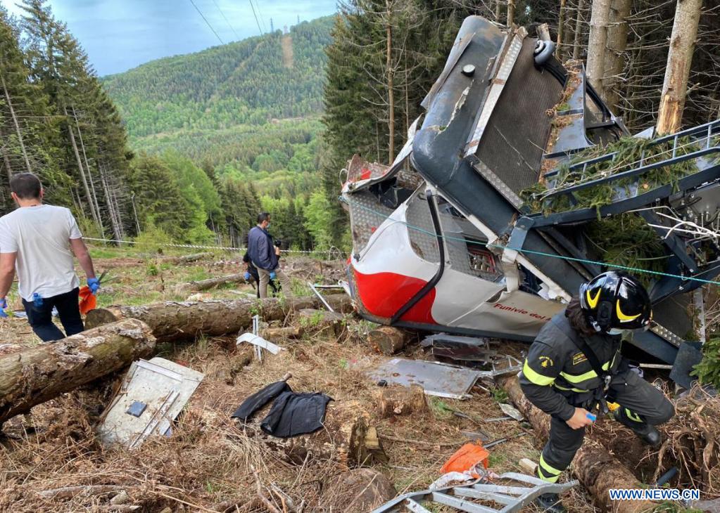 Rescuers work by the wreckage of a cable car after it falls in north Italy's Piedmont region, May 23, 2021. At least 13 people were killed when a cable car fell in north Italy's Piedmont region. (Vigili del Fuoco/Handout via Xinhua)