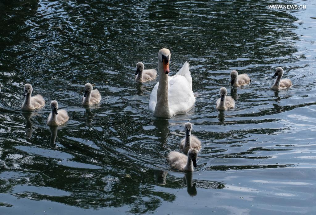 A swan cruises with cygnets in the sea in Saint-Laurent-du-Var, southern France, on May 27, 2021. (Photo by Serge Haouzi/Xinhua)