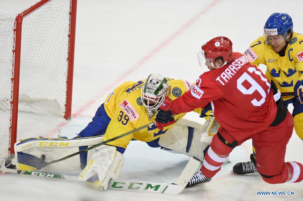 Sweden's goalkeeper Adam Reideborn (L) tries to make a save during a Group A match between ROC and Sweden at the 2021 IIHF Ice Hockey World Championship in Riga, Latvia, May 31, 2021. (Photo by Edijs Palens/Xinhua)