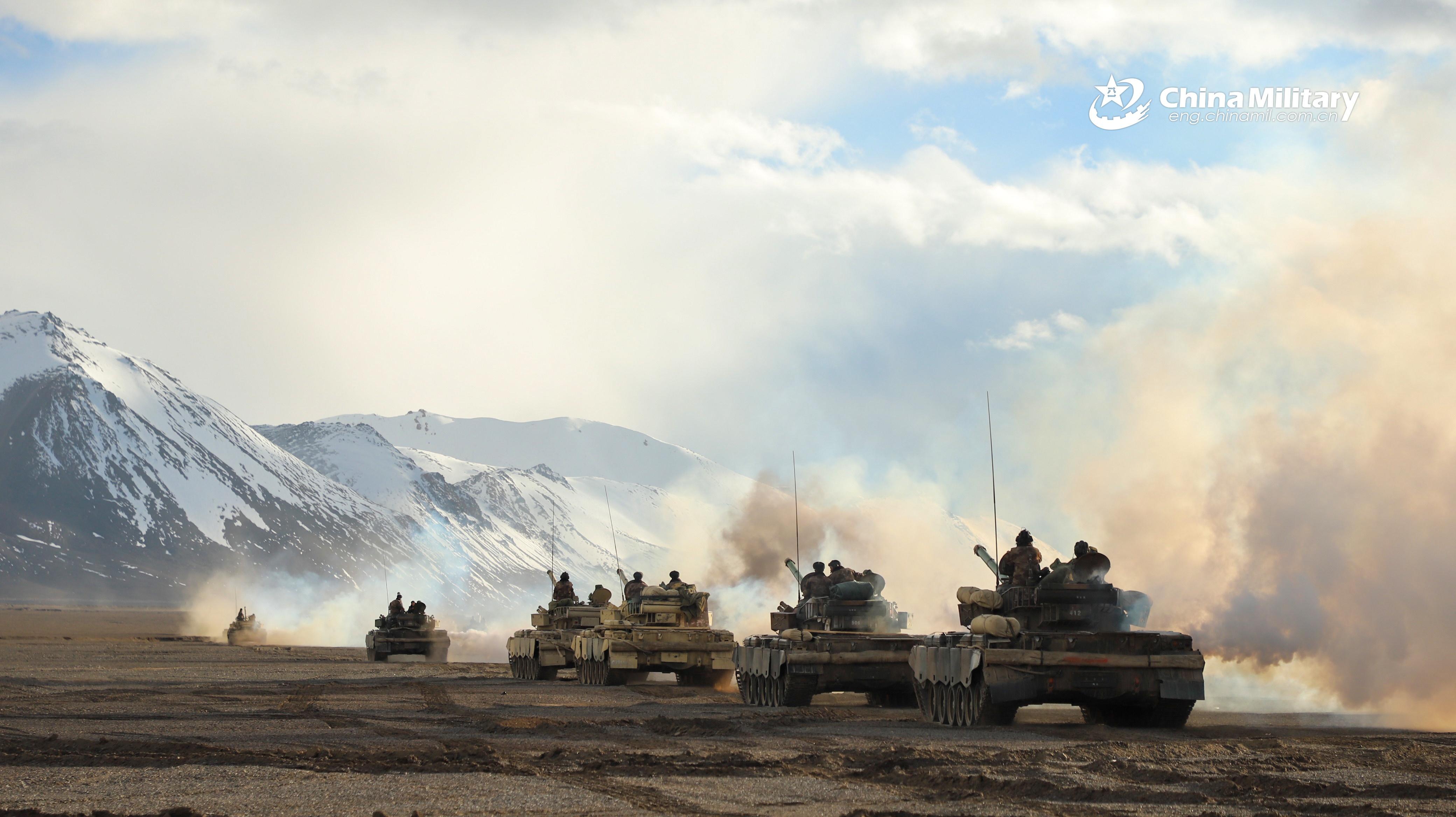 A group of main battle tanks attached to a tank detachment with a regiment under the PLA Xinjiang Military Command drive in speed, raising a cloud of dust during a long-distance maneuver in Xinjiang Uygur autonomous region on June 7, 2021. (eng.chinamil.com.cn/Photo by Shi Jinguang)