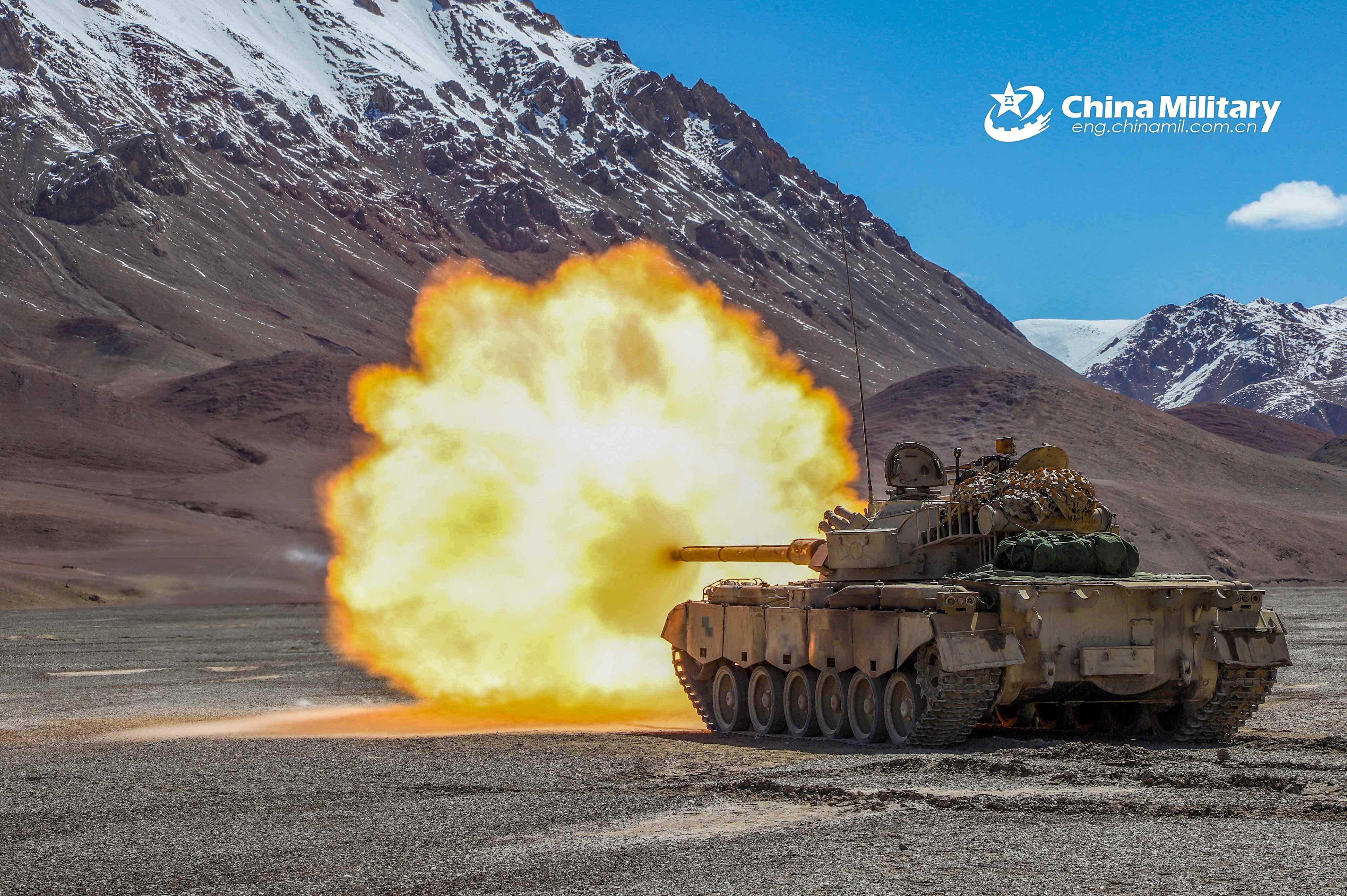 A main battle tank attached to a tank detachment with a regiment under the PLA Xinjiang Military Command spits fire with its main gun at mock targets during a live-fire training operation in Xinjiang Uygur autonomous region on June 7, 2021. (eng.chinamil.com.cn/Photo by Shi Jinguang)