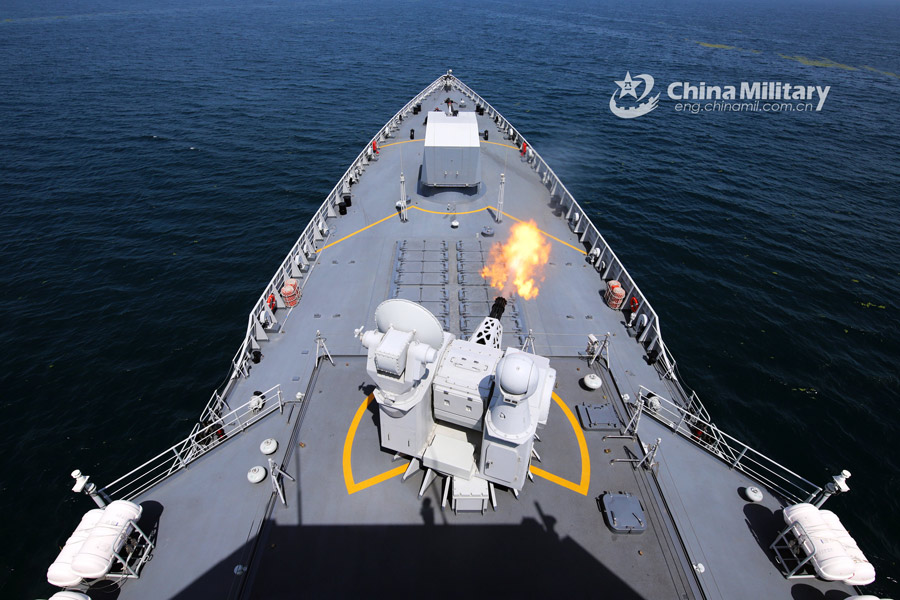 The guided-missile destroyer Qiqihar (Hull 121) attached to a destroyer flotilla with the navy under the PLA Northern Theater Command fires its close-in weapons system during a maritime live-fire test on June 7, 2021. (eng.chinamil.com.cn/Photo by Zhang Hailong)