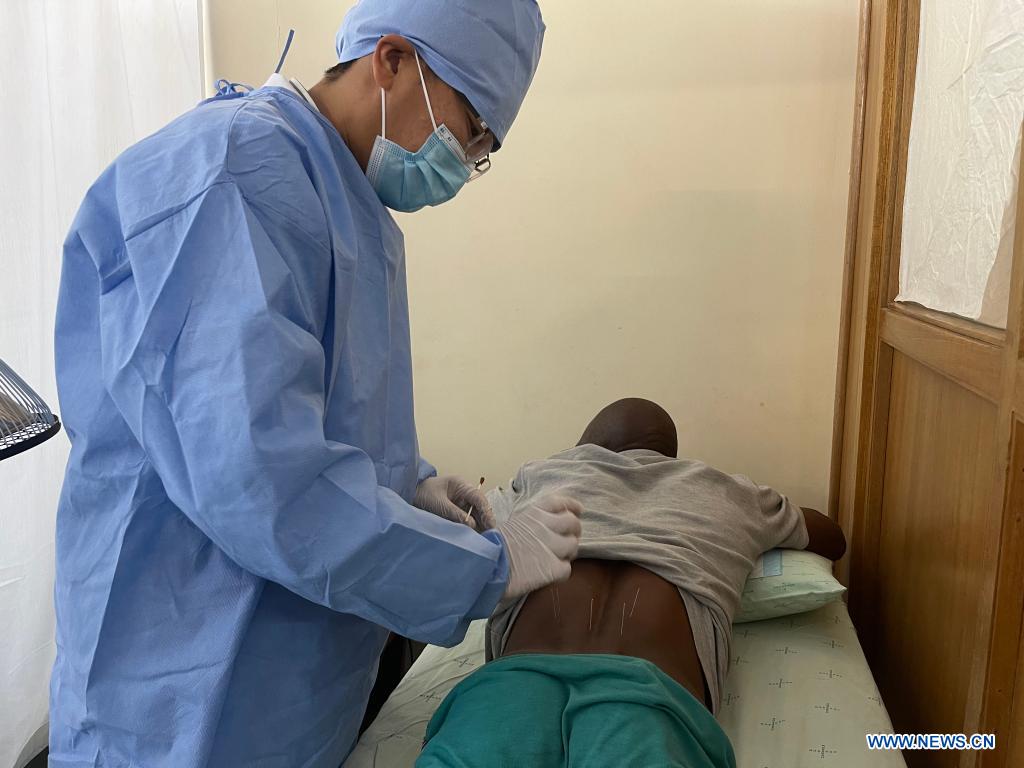 A Chinese doctor administers acupuncture at the Katutura State Hospital in Windhoek, Namibia, on June 16, 2021. The Chinese acupuncture department at the Katutura State Hospital in the Namibian capital Windhoek has widened its public reach, helping more locals re-gain health and physical mobility. (Photo by Ndalimpinga Iita/Xinhua)