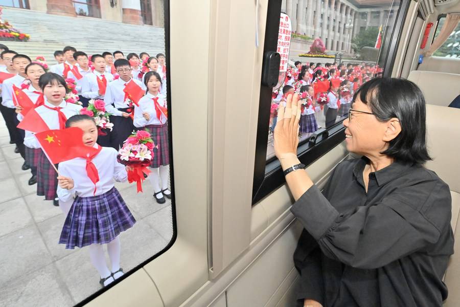 Medal recipient Zhang Guimei waves to children upon her arrival at the Great Hall of the People in Beijing, capital of China, June 29, 2021. (Xinhua/Yue Yuewei)