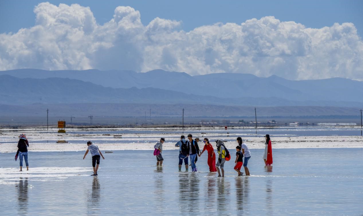 Tourists visit the Chaka Salt Lake, a scenic spot along the Qinghai-Tibet Highway. (Photo by Peng Huan/People’s Daily Online)