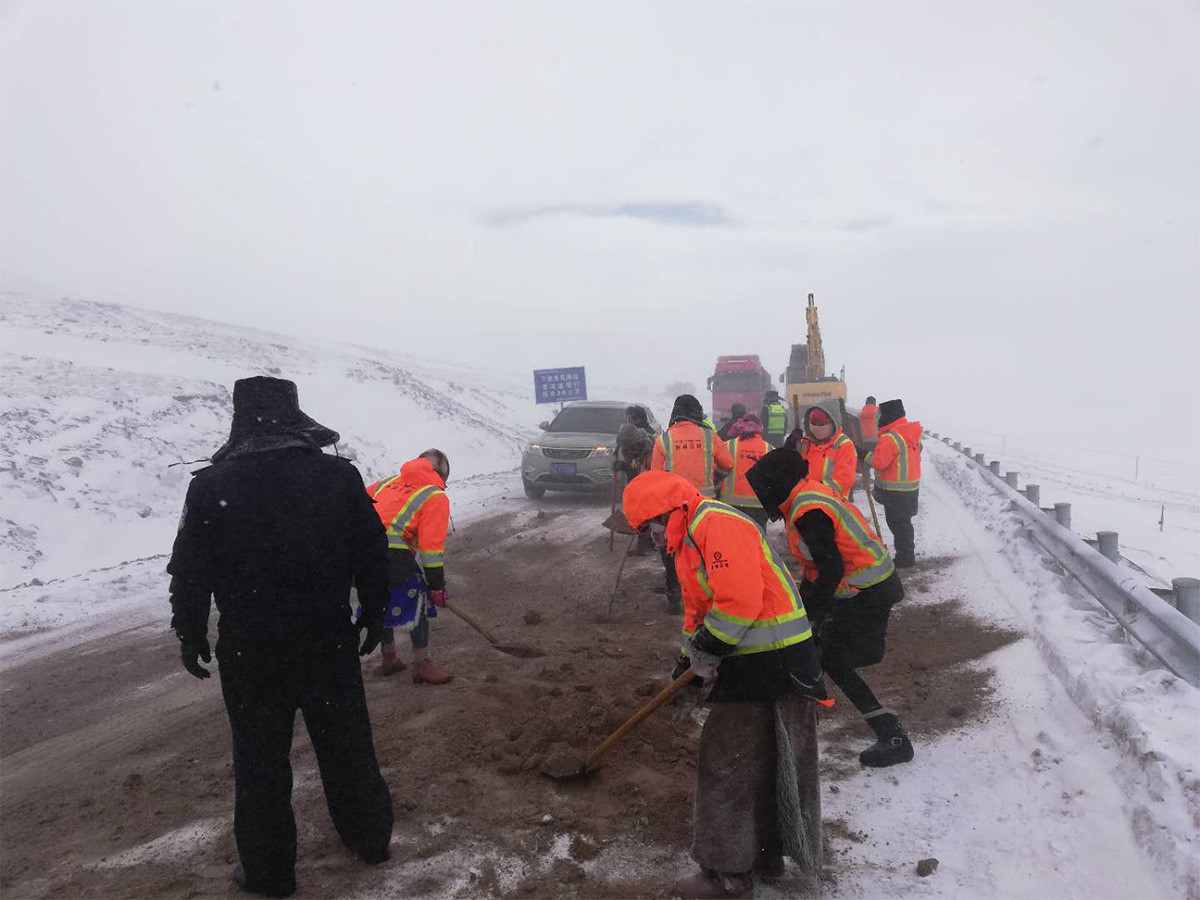 Staff members of the road transportation administrative bureau responsible for the management of the Qinghai-Tibet Highway clear the highway in a storm. (Photo/zgjtb.com)