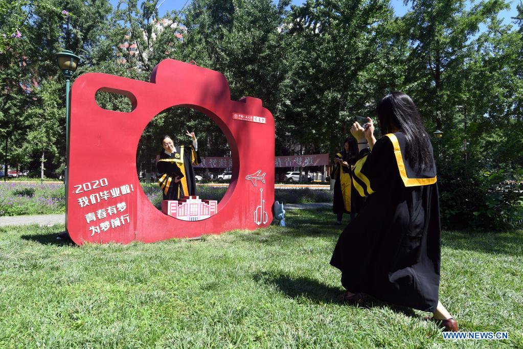 A graduate of 2020 poses for photos on the campus of Renmin University of China in Beijing, capital of China, July 4, 2021. Renmin University of China held a commencement ceremony for the graduates of 2020 on Sunday. Last year, in order to reduce the risk of infection of COVID-19, only a minority of graduates attended the ceremony on site with the others attending online. (Xinhua/Ren Chao)