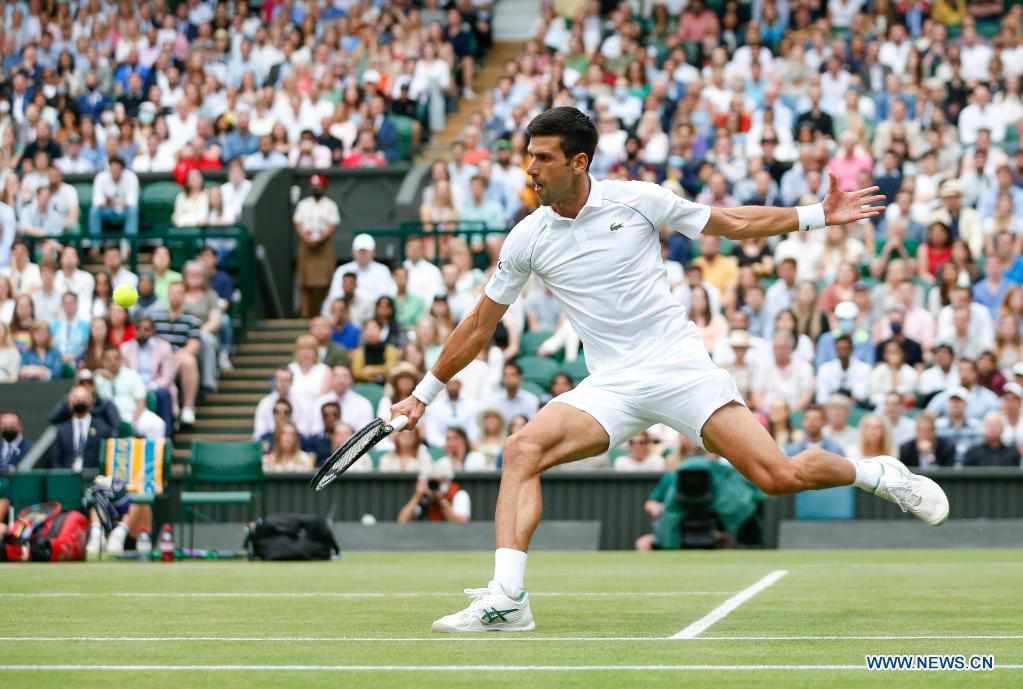 LONDON, July 9 (Xinhua) -- World No. 1 Novak Djokovic is one victory away from his 20th Grand Slam title as the Serbian beat Canadian Denis Shapovalov 7-6(3), 7-5, 7-5 in the men's singles semifinals at the Wimbledon Championships on Friday.