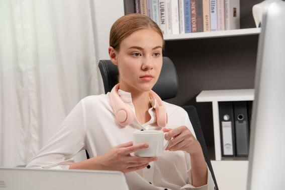 Photo shows a woman wearing a portable neck fan. (Photo courtesy of Tmall)