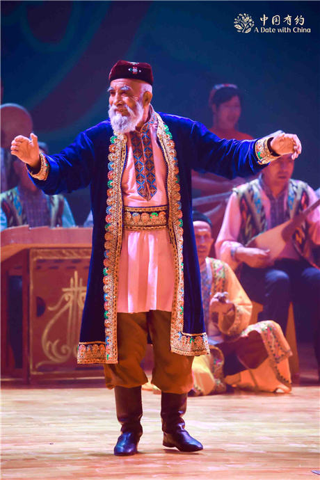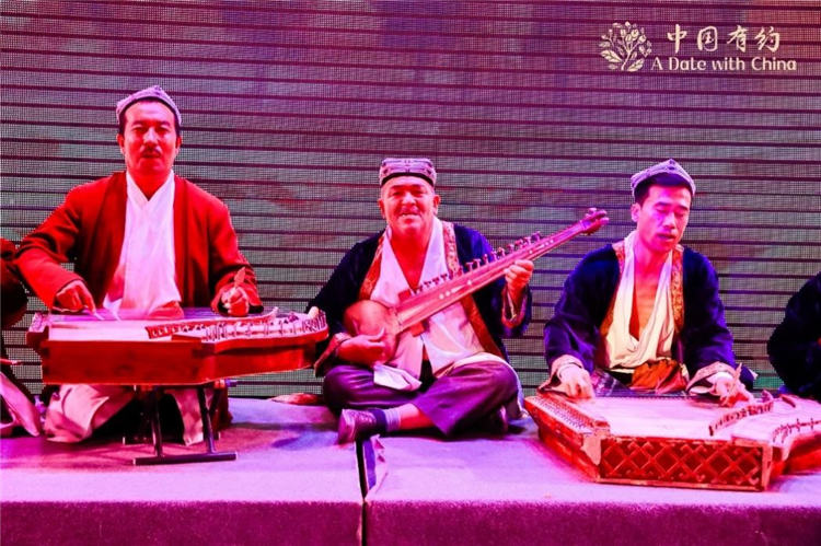 A stage photo of the original musical Twelve Muqam in Shache county, Kashgar, northwest China's Xinjiang Uygur Autonomous Region. (Photo courtesy of “A Date With China” media tour)