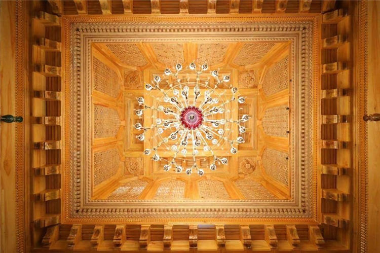 Photo shows the woodcarved ceiling of a teahouse in Hotan, northwest China's Xinjiang Uygur Autonomous Region. (China Central Television/Chen Shangyu)