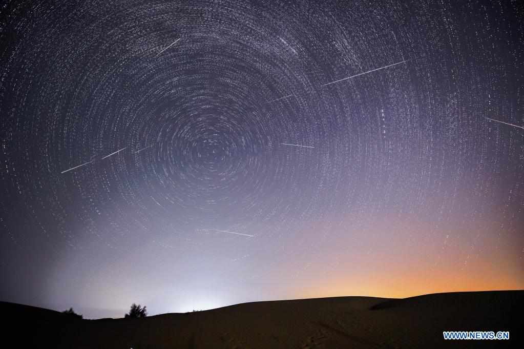 Photomontage taken on Aug. 13, 2021 shows the night sky during the Perseid Meteor Shower above an ecological demonstration zone of Engebei in Kubuqi Desert, north China's Inner Mongolia Autonomous Region. (Xinhua/Lian Zhen)