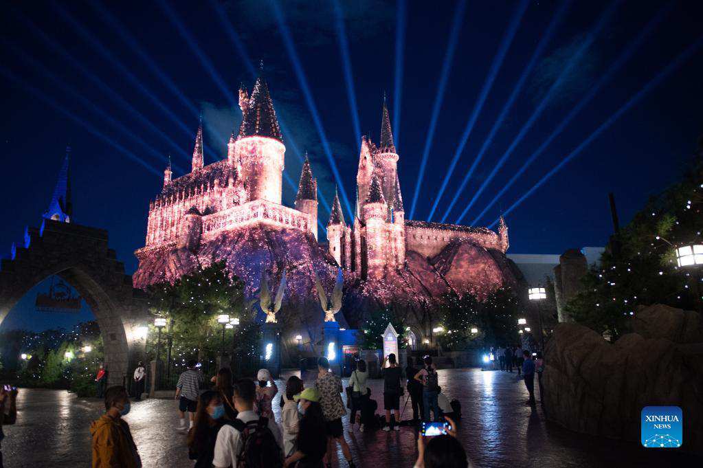 Photo taken on Aug. 25, 2021 shows a light show at the Universal Beijing Resort (UBR) in Beijing, capital of China. The UBR will officially start a trial opening for invite-only guests on Sept. 1 with comprehensive COVID-19 prevention and control measures. According to the UBR, attractions, shows, facilities and services will be gradually opened for invite-only guests during the trial opening, and improvements will be made on the basis of feedbacks. (Xinhua/Chen Zhonghao)