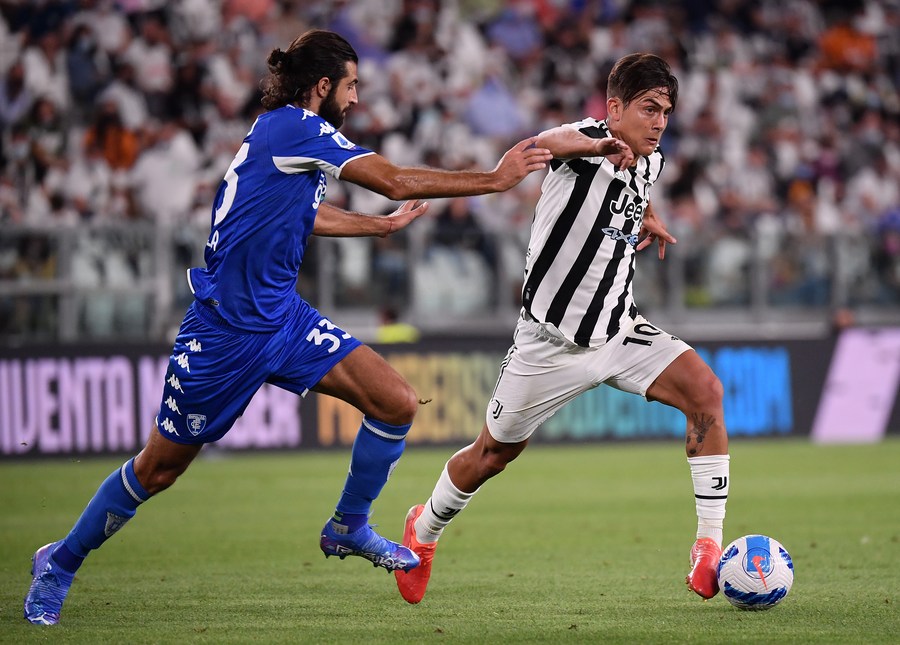 FC Juventus' Paulo Dybala (R) vies with Empoli's Sebastiano Luperto during a Serie A match between FC Juventus and Empoli in Turin, Italy, on Aug 28, 2021. (Photo by Federico Tardito/Xinhua)