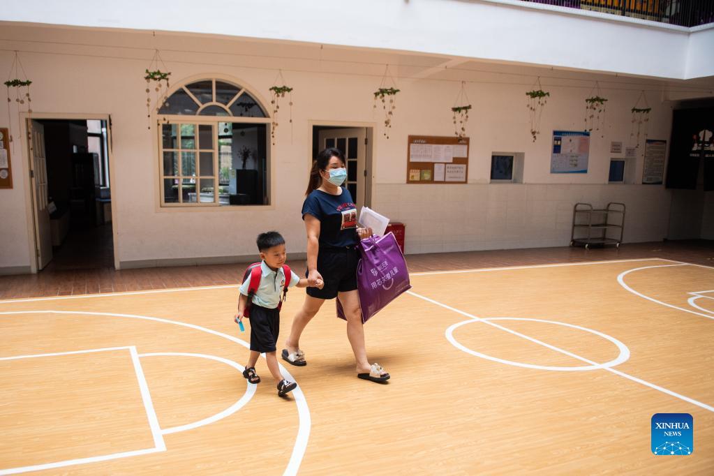 A woman and her child arrive at a kindergarten in Changsha, central China's Hunan Province, Sept. 6, 2021. Kindergartens in the city kicked off a new semester in orderly manner with sufficient COVID-19 precaution measures. (Xinhua/Chen Sihan)