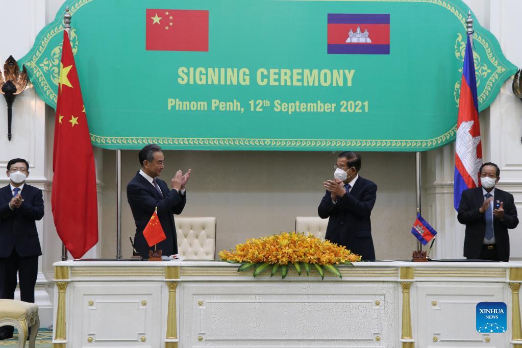 Cambodian Prime Minister Samdech Techo Hun Sen (2nd R) and visiting Chinese State Councilor and Foreign Minister Wang Yi (2nd L) attend a signing ceremony of bilateral cooperation documents in Phnom Penh, Cambodia, on Sept. 12, 2021. (Xinhua/Mao Pengfei)