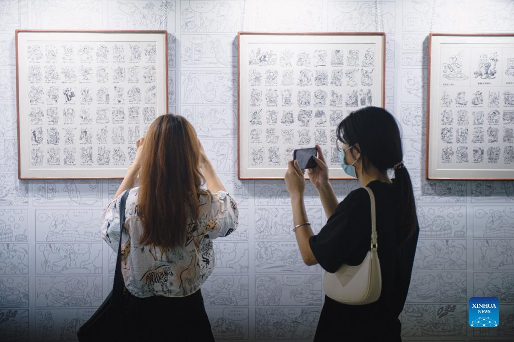 Visitors take pictures of works at the 17th China International Cartoon and Animation Festival (CICAF) in Hangzhou, capital of east China's Zhejiang Province, Sept. 30, 2021. The 17th China International Cartoon and Animation Festival (CICAF) kicked off Thursday in Hangzhou, attracting participants from more than 50 countries and regions. The festival was scheduled from Sept. 30 to Oct. 4. (Xinhua/Jiang Han)