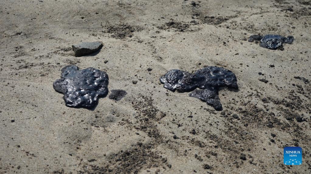Oil stains the Huntington Beach in Orange County, California, Oct. 3, 2021. A massive oil spill off the Orange County coast in Southern California prompted the closure of a 9-kilometer long beachfront area on Oct. 3, and crews from California Department of Fish and Wildlife (CDFW) are cleaning up the pollution from facilities in federal waters. (Photo by Zeng Hui/Xinhua)