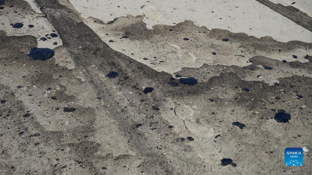 Oil stains the Huntington Beach in Orange County, California, Oct. 3, 2021. A massive oil spill off the Orange County coast in Southern California prompted the closure of a 9-kilometer long beachfront area on Oct. 3, and crews from California Department of Fish and Wildlife (CDFW) are cleaning up the pollution from facilities in federal waters. (Photo by Zeng Hui/Xinhua)