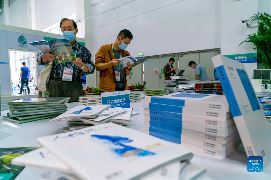 Journalists read books at the media center of the 15th meeting of the Conference of the Parties to the UN Convention on Biological Diversity (COP15) in Kunming, southwest China's Yunnan Province, Oct. 9, 2021. The media center of the COP15 opened here on Saturday. The COP15 is set to kick off in Kunming on Oct. 11. (Xinhua/Chen Xinbo)