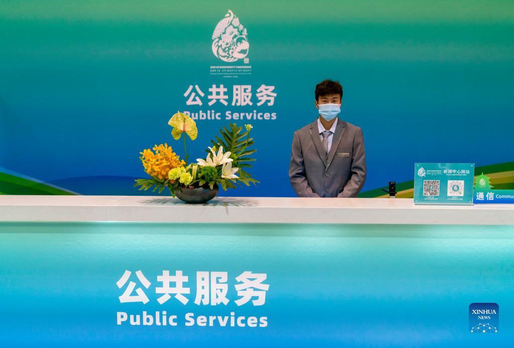 A staff member works at the media center of the 15th meeting of the Conference of the Parties to the UN Convention on Biological Diversity (COP15) in Kunming, southwest China's Yunnan Province, Oct. 9, 2021. The media center of the COP15 opened here on Saturday. The COP15 is set to kick off in Kunming on Oct. 11. (Xinhua/Chen Xinbo)