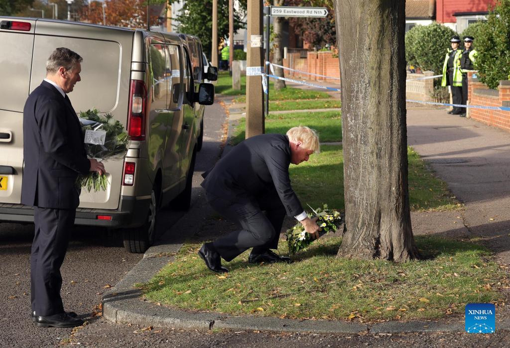 British Prime Minister Boris Johnson lays floral tributes to Sir David Amess in Leigh-on-Sea, Essex, Britain on Oct. 16, 2021. The murder of British lawmaker David Amess was declared a terrorist incident by London's metropolitan police on Saturday. Britain's ruling Conservative Party's member of the parliament (MP) David Amess has died after being stabbed on Friday at a constituency meeting in Essex, a county in southeastern England. (Photo by Andrew Parsons/No 10 Downing Street/Handout via Xinhua)